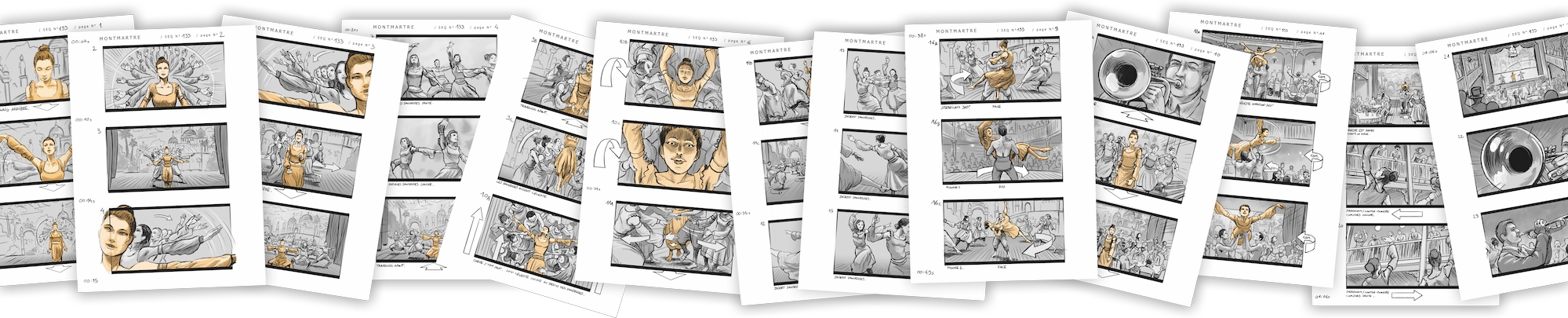 Début du storyboard de Johan Nus, pour la première danse de Céleste dans le cabaret.