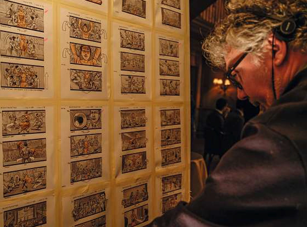 Le réalisateur Louis Choquette étudie le storyboard, réalisé par Johan Nus, de la séquence pour la chorégraphie du French cancan.