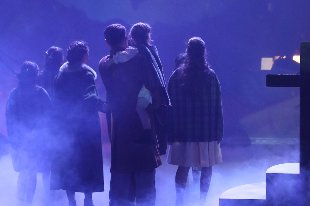 Pour montrer la tension et un futur sombre, nous faisons le choix d’une scénographie dépouillée et d’un éclairage froid. Maria, qui représente la liberté, apporte lumière et couleurs dans chaque scènes. Nous verrons ainsi, grâce à ses actions, accessoires et tenues devenir pastel. Nous ferons délibérément le choix de mettre en avant les couleurs des pays actuellement envahis. Cette douceur s’effacera ensuite avec la montée des extrêmes, pour laisser place à un rouge vif en référence au Nazisme. Seule la fuite, permise par Maria, permettra à tous de rejoindre les plaines vertes, symboles d’espoir.